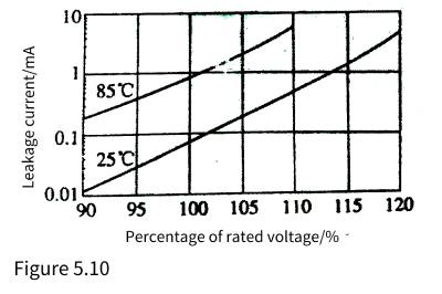 🍒In the data sheet, the leakage current test conditions for aluminum electrolytic capacitors are: the voltage is the rated voltage, and the temperature is the maximum operating temperature. At different voltages, the leakage current of an aluminum electrolytic capacitor varies with the applied voltage, as shown in Figure 5.9.