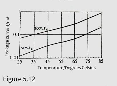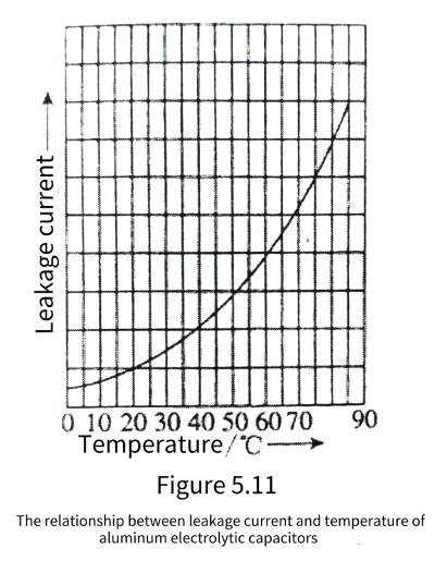 🥝From the qualitative relationship, taking an aluminum electrolytic capacitor with a maximum operating temperature of 85°C as an example, the variation trend of leakage current and temperature is shown in Figure 5.11. It can be seen that the leakage current of aluminum electrolytic capacitors increases significantly with the increase of temperature.