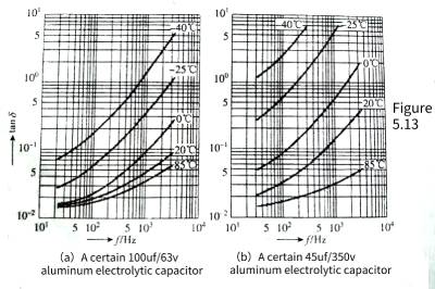 🥬Ambient temperature and operating frequency have obvious effects on the loss factor of aluminum electrolytic capacitors. Figure 5.13 shows the relationship between the dissipation factor of aluminum electrolytic capacitors, temperature and frequency.