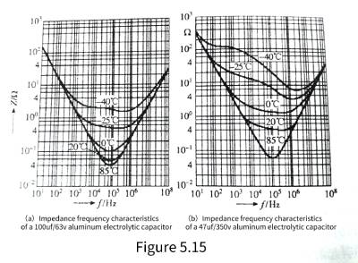 🥂 The resistance of the electrolyte is the main part of the ESR of the aluminum electrolytic capacitor. Moreover, the resistivity of most electrolytes decreases with the increase of temperature, so the ESR of electrolytic capacitors also decreases with the increase of temperature. For example, the relationship between the impedance frequency characteristics and temperature of a 100UF/63 V and 47UF/350 V aluminum electrolytic capacitor is shown in Figure 5.15. The graph shows the impedance frequency characteristics from -40 to +85°C typical temperature.