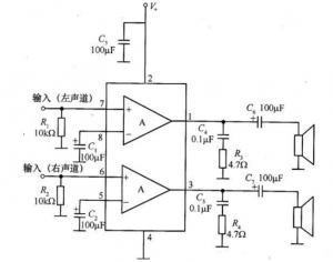 R1 and R2 are input bias resistors, C1 and C2 are grounding capacitors at the negative feedback terminal, C6 and C7 are output coupling capacitors, R3, C4 and R4, and C5 are high-order harmonic suppression circuits to prevent circuit oscillation.