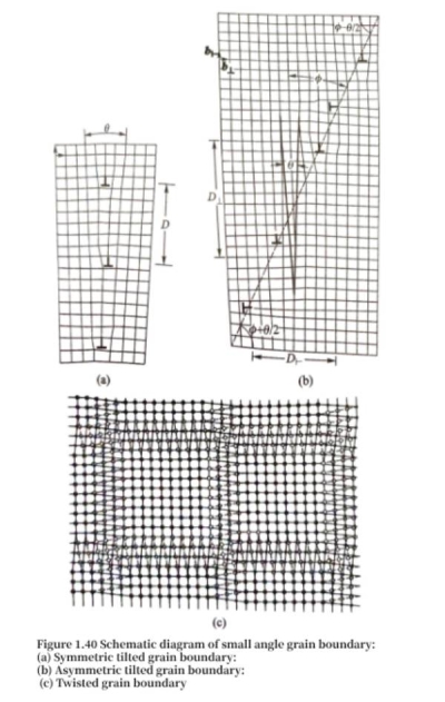 Small-angle grain boundaries are composed of arranged dislocations and can be described by a simple model. If a crystal is first cut into two parts along a certain crystal plane, and then rotated around a certain direction on the cut surface by a very small angle θ, and then the cut surfaces of the two parts of the crystal are cut into parallel surfaces and merged together, the merged surface is a tilted grain boundary. Figure 1.40 (a) is a schematic diagram of a symmetrical tilted grain boundary in a crystal. The relative orientation of the two sides of the grain boundary is generated by rotating the angle θ, and the interface is a symmetry plane close to the low-index crystal plane. The joining of two grains in this way will inevitably produce distortion in the connection area, and these distortions can be relaxed on the interface by a row of edge dislocations with a Burgers vector length of b. It can be easily seen from Figure 1.40 (a) that the relationship between the dislocation Burgers vector length b, the dislocation spacing D and the rotation angle θ should be as follows: