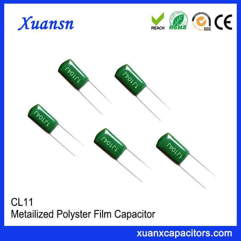 0.1 uf polyester capacitor cL11 50V lead wire directly spot welded to the electrode, low loss, high mechanical strength and moisture resistance, suitable for various electronic instrument watches.
