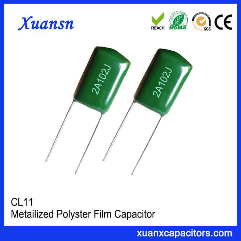102J mylar film capacitor CL11 with inductive structure. It is made of polyester film as the dielectric and aluminum foil as the electrode. It is widely used in the DC and pulse circuits of broadcast TV products, communication equipment, displays and various electronic instruments.