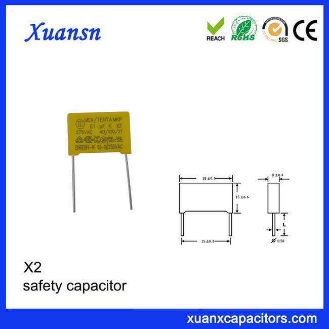 104k 275v mkp film capacitor, The metal polypropylene film can withstand over-pressure shock and excellent flame-retardant performance, and is widely used in anti-interference situations such as power supply line circuits.