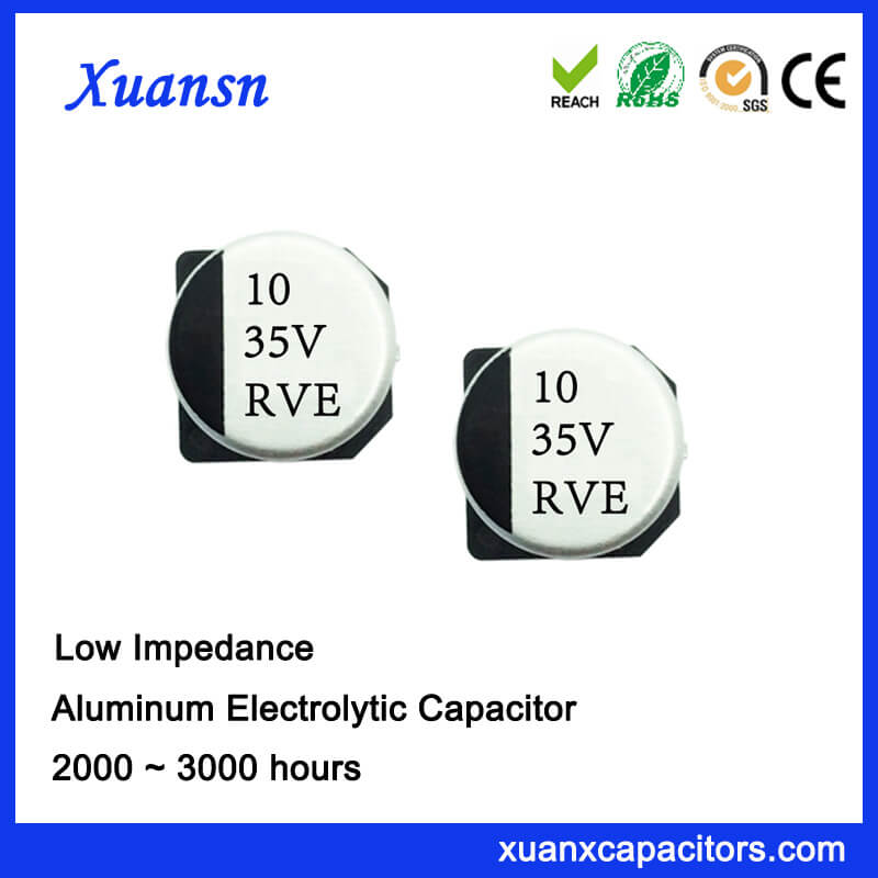 High frequency Low impedance 10uf 35v SMD electrolytic capacitor is available for high density surface mounting and reflow soldring, and it has high stability and reliability.
