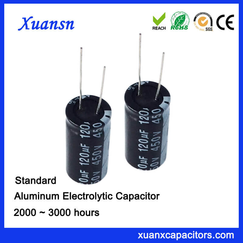 120UF 450V Aluminum Electronic Capacitor Lead, its size is 18*40mm, its ripple current is 332mAmrs at 85℃ 120Hz. And its load life is 3000 hours at 105℃.