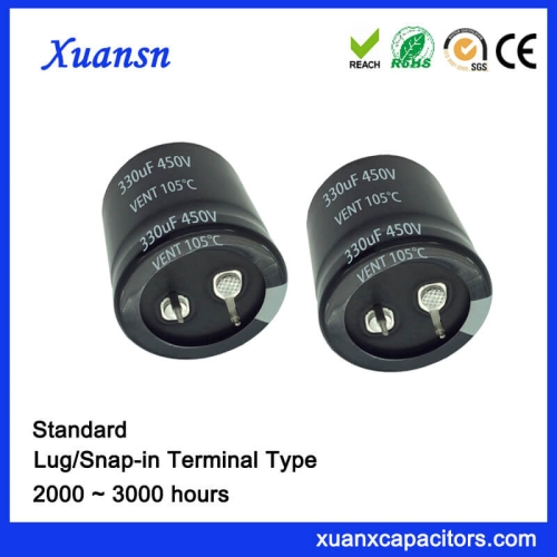 Xuansn 2000 to 3000 hours 120UF 450V Standard Snap In Capacitor electrolytic, its surge voltage is 500v, its Max ESR is 2212mΩ and Typ ESR is 1106mΩ at 105℃ 120Hz. And its size has 22*45mm and 25*35mm, its ripple current is 0.73mAmrs at 105℃ 120Hz.