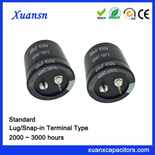 The standard snap in aluminum electrolytic capacitor is suitable for Electric welding machine, Frequency converter, Color TV, computer, Photovoltaic (pv), Instrumentation instrument and Household appliances, ect.
