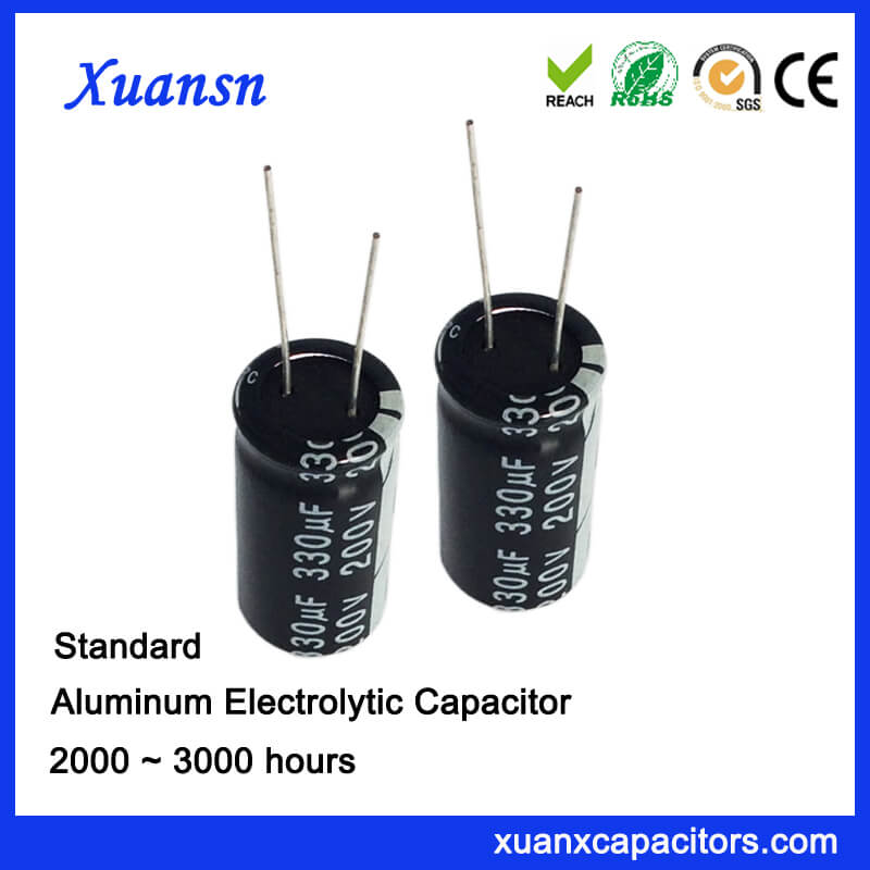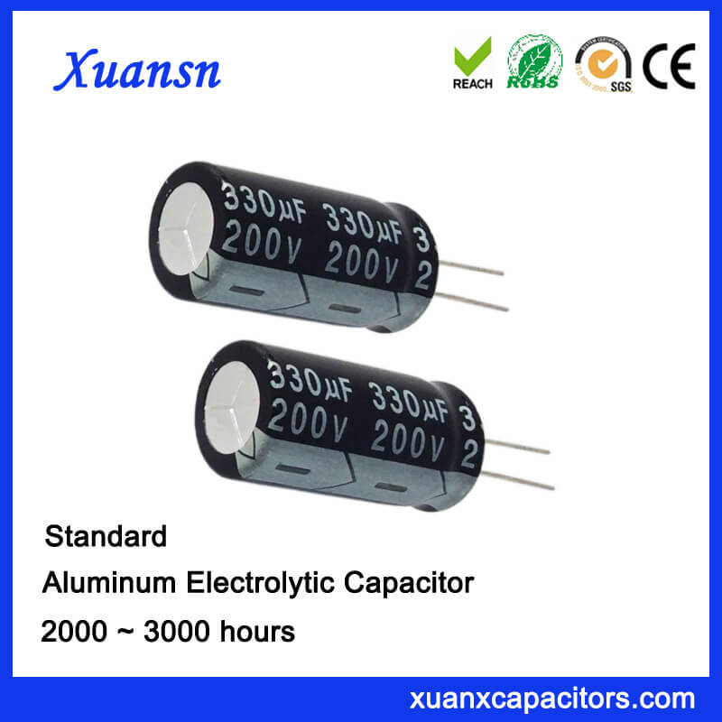 200V 330UF Aluminum Electrolytic Capacitor For Adapter, its size is 18*36, its ripple current is 760mAmrs at 85℃ 120Hz. And its load life is 3000 hours at 105℃.
