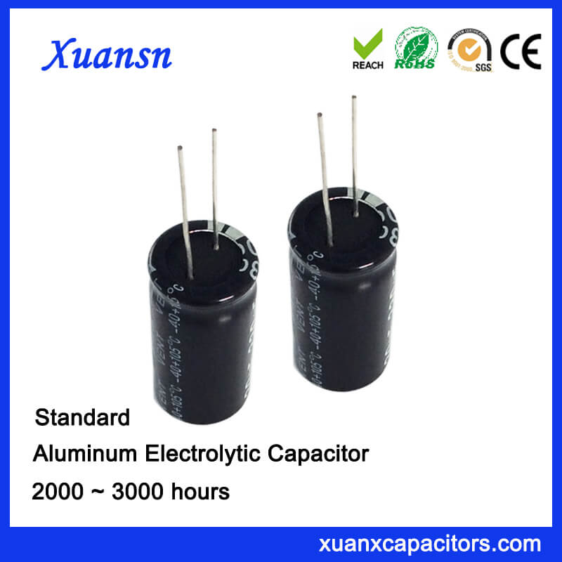 Standard radial aluminum electrolytic capacitor is suitable for charger, adapter, air conditioning and rear projection TV.