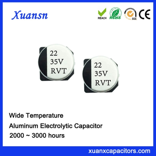 22uf 35v SMD Aluminum Electrolytic Capacitor Chip Type, its operating temperature range is -55℃ to +105℃ standard product, its size is 5*5.4 and 6.3*5.4 mm, and its rated ripple current is 28mArms and 40mArms at 120Hz, 105℃.