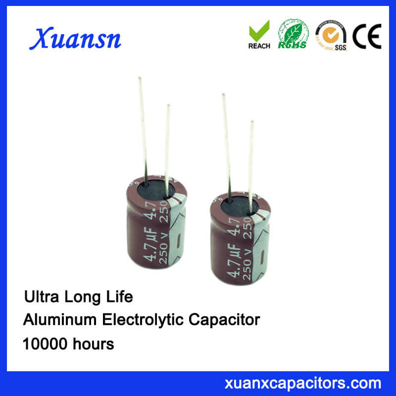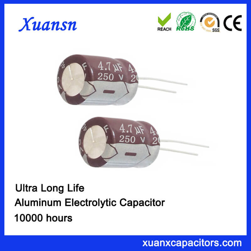 4.7UF 250V Electrolytic Capacitor 10000hours is long life series. The radial alumium electrolytic capacitor is suitable for LED power supply, , waterproof power supply, street lamp power supply, mining lamp power supply, ballast and household appliances.