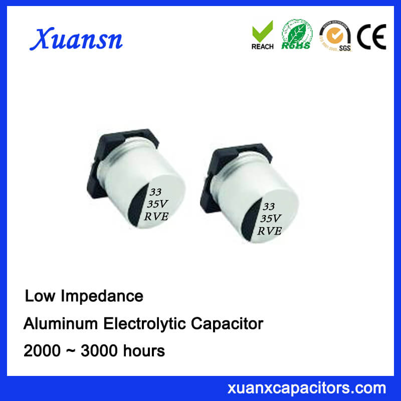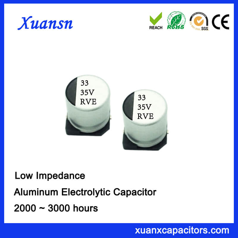 33UF 35V SMD Low Impedance Capacitor is our high frequency and low impedance series. The SMD aluminum electrolytic capacitor is suitable for suitable for reflow soldering and high density surface assembly.