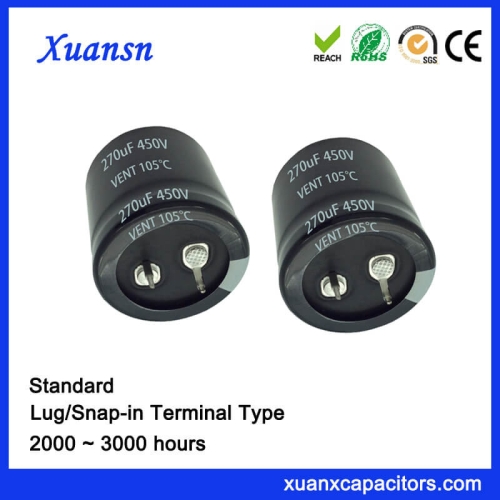 The standard snap in aluminum electrolytic capacitor is suitable for Electric welding machine, Frequency converter, Color TV, computer, Photovoltaic (pv), Instrumentation instrument and Household appliances, ect.