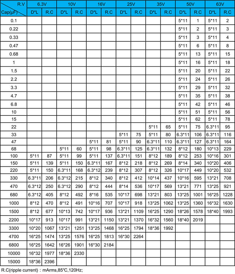 | 0.1 to 47 uf | 0.75 | 1 | 1.35 | 1.55 | 2 |