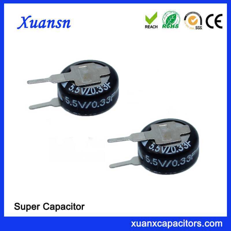 5.5 v 0.33 f V-type super capacitor has high capacity, low internal resistance and good consistency. Typical applications are in RAM, consumer electronics, military industry, smart grids, backup power supplies, toys, etc.