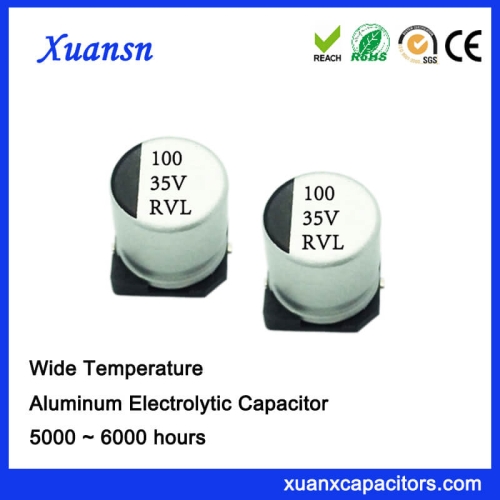 SMD long life aluminum electrolytic capacitor is available for high density surface mounting and reflow soldring, and it has high stability and reliability.