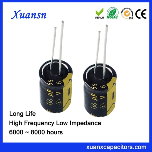 63V 68UF Electrolytic Capacitor 8000Hours 105℃ is our long life series, its size is 8*12mm, its ripple current is 197mAmrs at 105℃ 120Hz.