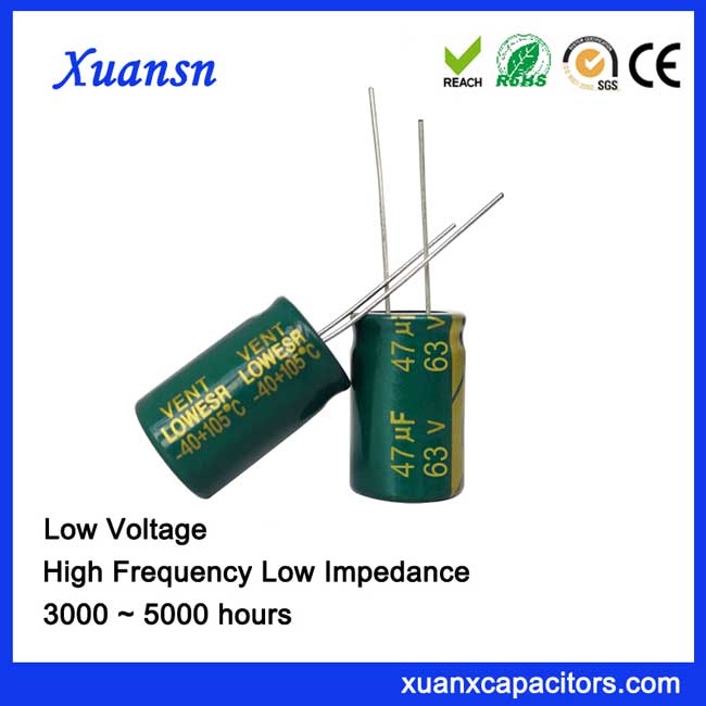 bypass capacitor in amplifier 47uf63v, dark green housing, operating frequency 100KHZ. Suitable for LED drive, lighting, switching power supply and air conditioning control panels, etc., XUANSN capacitors, high reliability capacitors, leading brands in the electrolytic capacitor industry.