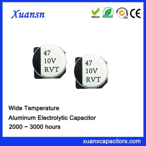 China SMD 47uf 10v Electrolytic Capacitor Chip Type, its operating temperature range is -55℃ to +105℃ standard product, its size has 5*5.4 and 6.3*5.4 mm, and they are rated ripple current are 31mArms and 42mArms at 120Hz, 105℃.