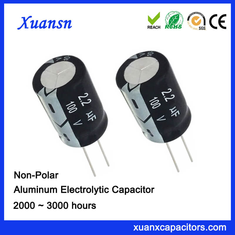 Radial Alulminum Electrolytic Capacitor 2.2uf 100v is our 2000 to 3000 hours non-polarity series. The non polarity radial alumium electrolytic capacitor is used in circuits with reversing polarity