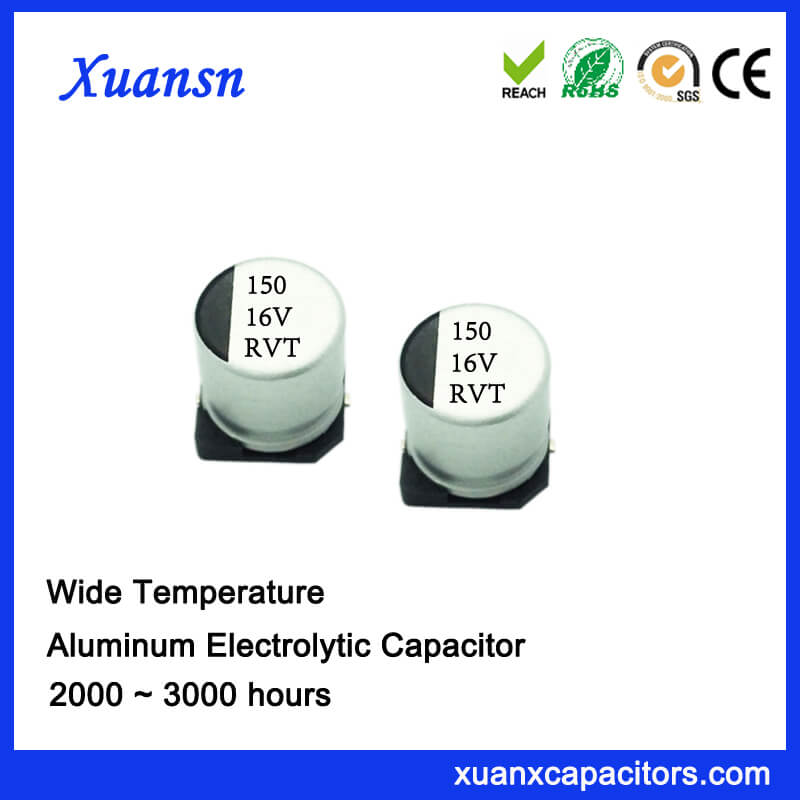 China V-Chip 150UF 16V 105℃ 2000Hours Capacitor, its operating temperature range is -55℃ to +105℃ standard product, its size has 6.3*7.7 mm, and they are rated ripple current are 100 mArms at 120Hz, 105℃.