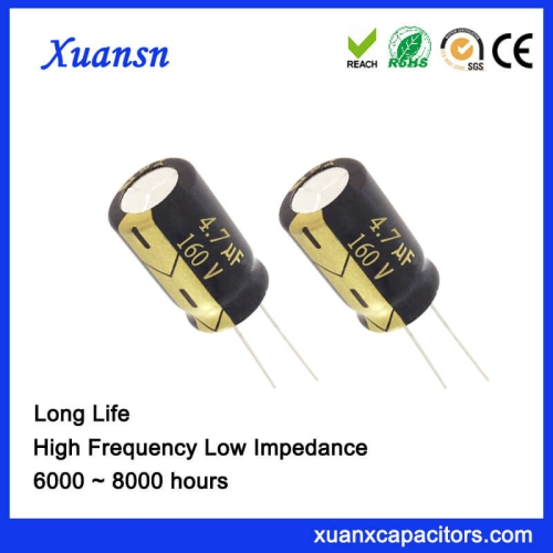 Xuansn factory manufacturing and supply of Custom Long Life 4.7UF 160V Aluminum Electrolytic Capacitor.