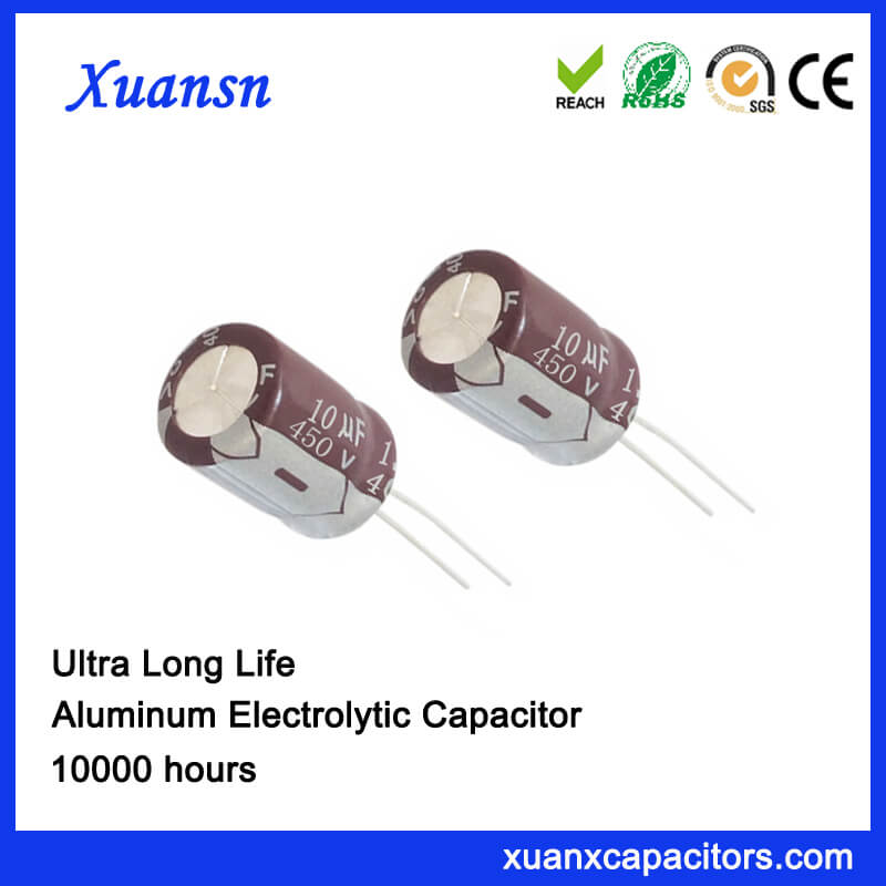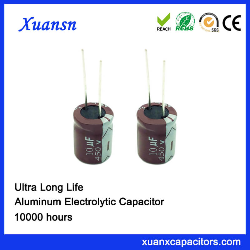 Electrolytic Capacitor 10uf 450v For waterproof led power supply is our long life series, its withstanding  load life of 10000 hours at 105°C, its size is 13*21mm, its ripple current is 288mAmrs at 105℃ 120Hz.