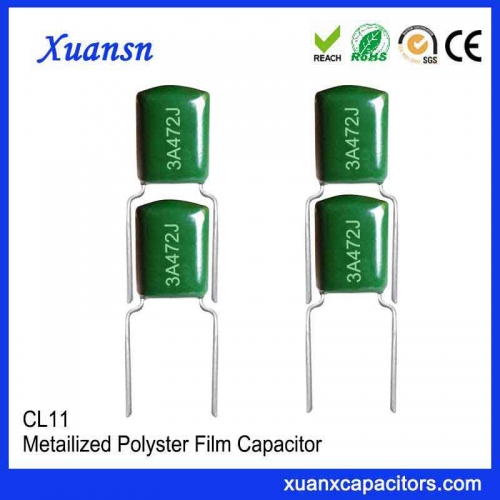 CL11 polyester capacitor 472J1200v 1. Polyester film metal foil type, induction winding structure. 2. Since the wire is directly welded to the foil, the dissipation factor is very small. 3. Epoxy resin impregnated with epoxy resin.