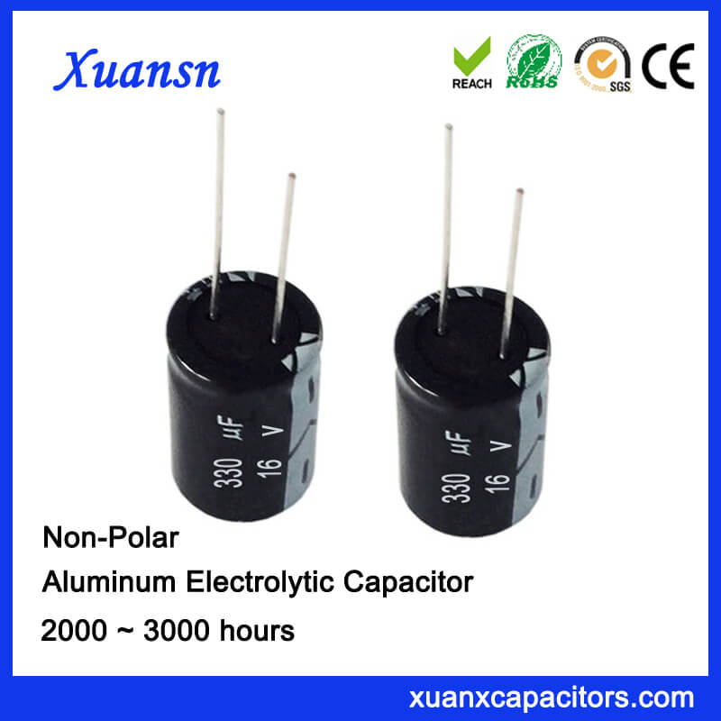 330UF16V Non-Polar Capacitor is our 2000 to 3000 hours non-polarity series. The non polarity radial alumium electrolytic capacitor is used in circuits with reversing polarity