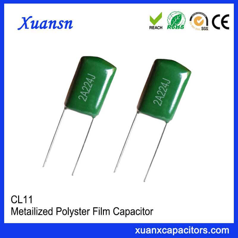 film capacitor CL11 2A224J is of inductive structure. It is made of polyester film as the dielectric and aluminum foil as the electrode. The lead wire is tinned copper Baosteel wire and epoxy resin encapsulation. It is suitable for DC and pulse circuits of various electronic instruments.