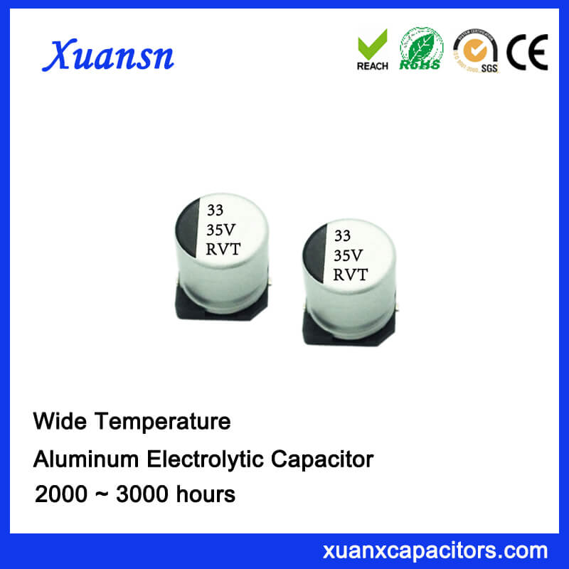Good Quality 33uf 35v SMD Aluminum Electrolytic Capacitor, its operating temperature range is -55℃ to +105℃ standard product, its size has 6.3*5.4 and 8*6.5 mm, and they are rated ripple current are 45 and 86 mArms at 120Hz, 105℃.