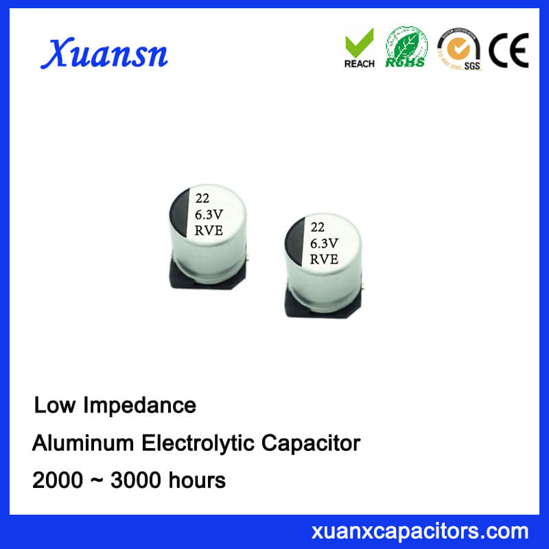 High frequency Low impedance 22uf 6.3v SMD electrolytic capacitor is available for high density surface mounting and reflow soldring, and it has high stability and reliability.