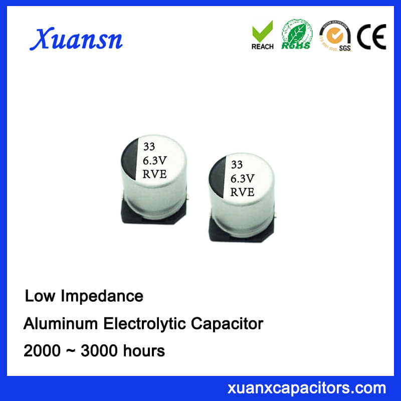 High frequency Low impedance 33uf 6.3v SMD electrolytic capacitor is available for high density surface mounting and reflow soldring, and it has high stability and reliability.