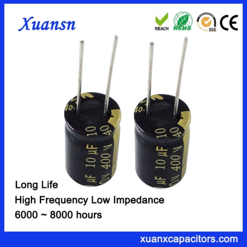 High Voltage 400V 10UF Capacitor Electrolytic 8000Hours is our long life products, its withstanding load life of 6000-8000 hours at 105°C, its size is 10*20mm, its ripple current is 82mAmrs at 105℃ 120Hz.