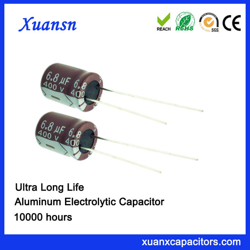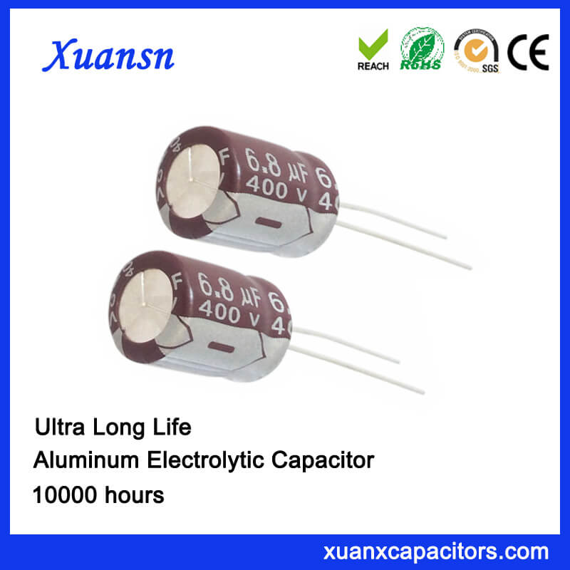 Xuansn has High Voltage 6.8uf 400v 10000hours Electrolytic Capacitor, 6.8uf 400v capacitor is our long life series, its withstanding load life of 10000 hours at 105°C, its size is 13*21mm, its ripple current is 198mAmrs at 105℃ 120Hz.
