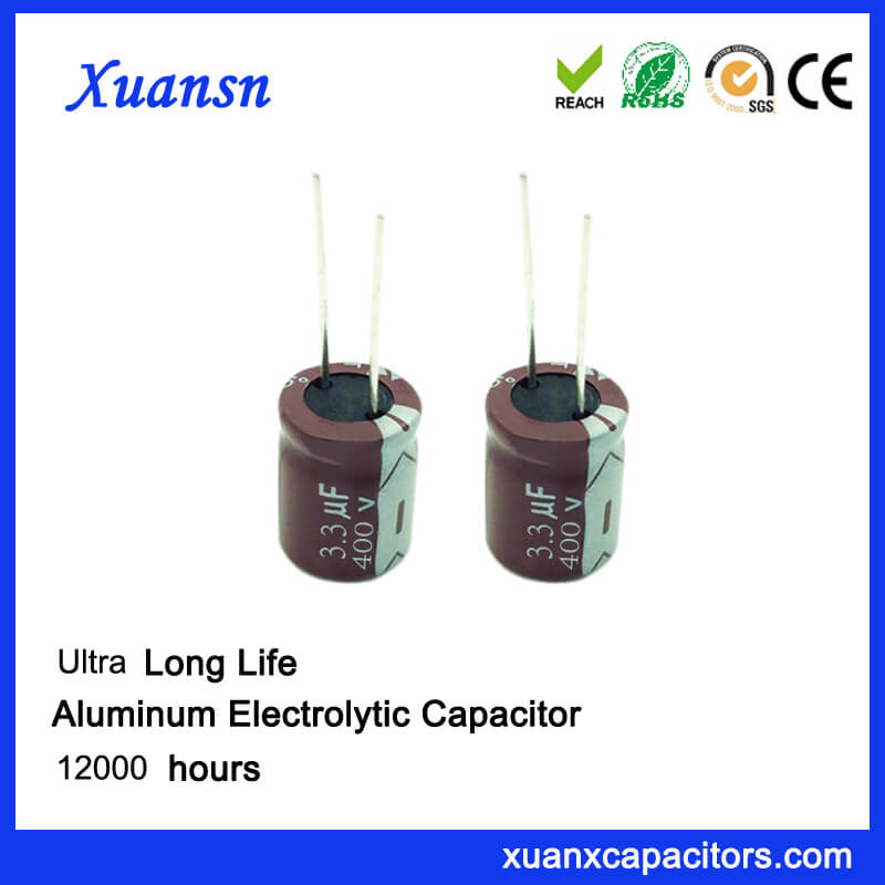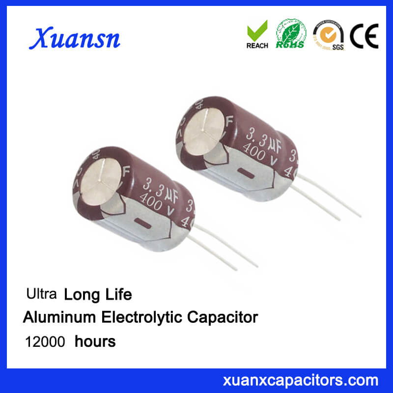 Long Life Capacitor 400V 3.3UF Radial Alulminum Electrolytic Capacitor. The radial alumium electrolytic capacitor is suitable for LED power supply, , waterproof power supply, street lamp power supply, mining lamp power supply, ballast and household appliances.