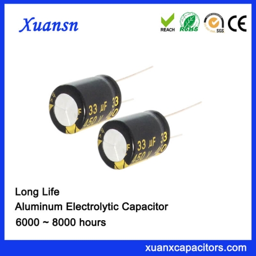 Xuansn Long Life Electrolytic capacitor For Street Lamp Power Supply. High voltage 33uf 450v aluminum electrolytic capacitor, its withstanding load life is 8000 hours at 105°C, its size have 13*20, 16*22 and 16*32mm, its ripple current is 193 mAmrs at 105℃ 120Hz.