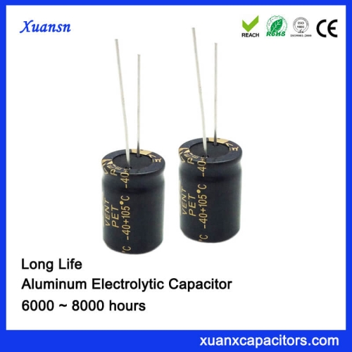 Xuansn Long Life Electrolytic Capacitor For Waterproof Power Supply. 33uf 400v electrolytic capacitor, its withstanding load life is 8000 hours at 105°C, its size have 13*20, 16*20 and 16*25mm, its ripple current is 211mAmrs at 105℃ 120Hz.