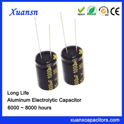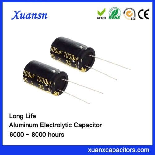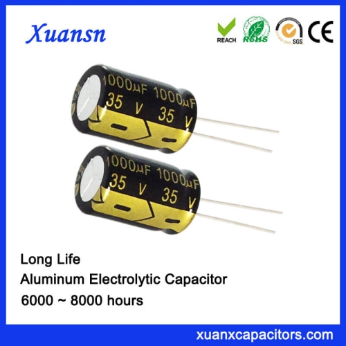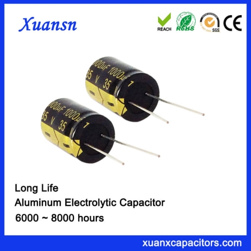Radial Long Life 1000uf 35v 105c Electrolytic Capacitor, its withstanding load life of 6000-8000 hours at 105°C, its size is 13*21mm, its ripple current is 974mAmrs at 105℃ 120Hz.