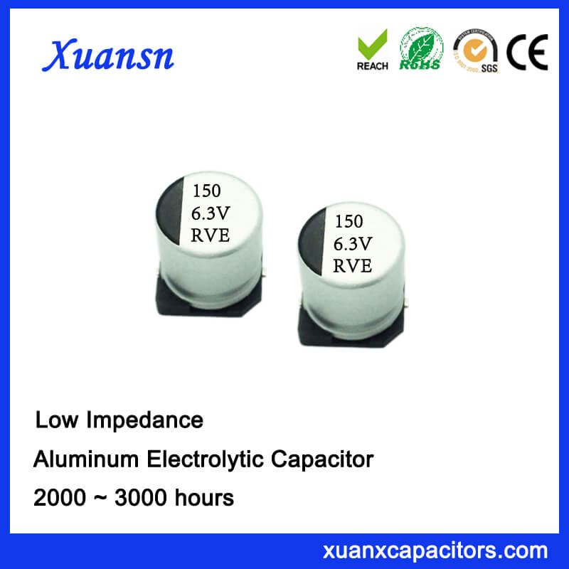 High frequency Low impedance 150uf 6.3v SMD electrolytic capacitor is available for high density surface mounting and reflow soldring, and it has high stability and reliability.