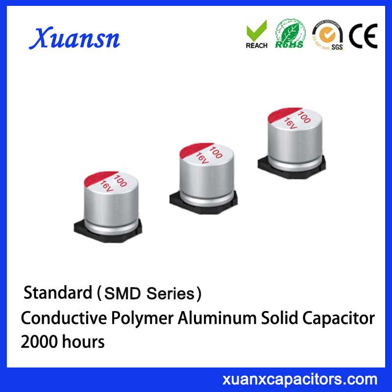 SMD solid aluminum electrolytic capacitor have solid conductivity, excellent frequency characteristics and life span, and are suitable for low voltage and high current applications.