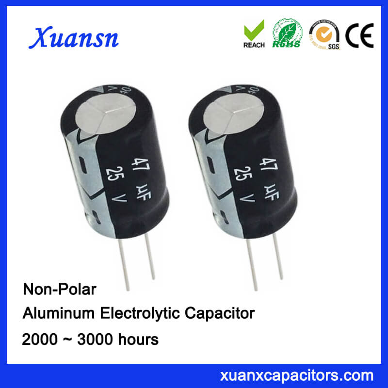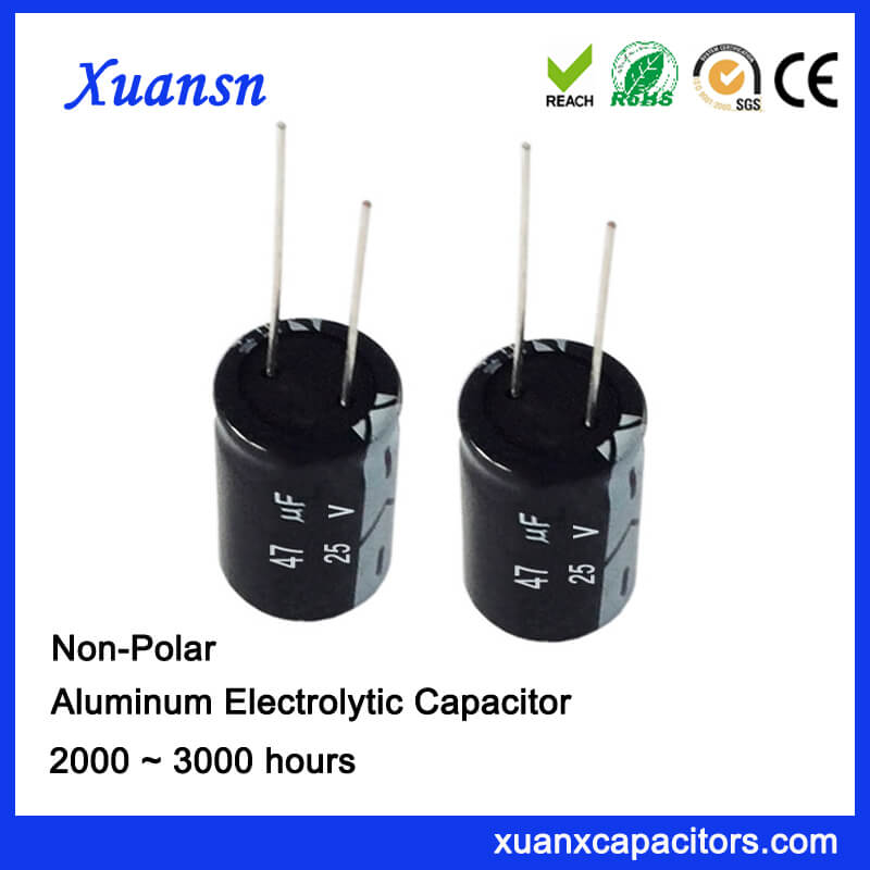 47uf 25v Radial Alulminum Electrolytic Capacitor is our 2000 to 3000 hours non-polarity series. The non polarity radial alumium electrolytic capacitor is used in circuits with reversing polarity
