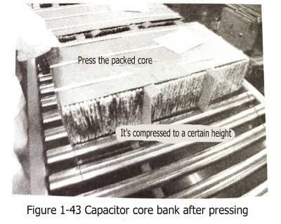 🌼According to the core assembly drawing, place the splint, components, gaskets, connectors and other components in sequence. Using the press, press the core to a certain height according to the compression coefficient, and then put on the hoop or binding and packing tape, and the core loading is completed. Figure 1-42 shows the core pressing process, Figure 1 -43 is the capacitor core group that has been press-fitted.