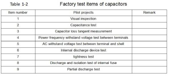 ☀️The purpose of the capacitor factory test is to check the defects in the manufacture and measure whether the indicators of the capacitor meet the requirements of the standard and technical agreement. Test sequence: Capacitance measurement and loss tangent measurement test should be carried out after the power frequency withstand voltage test, and the sequence of other tests may not be specified. The factory test items are shown in Table 1-2.
