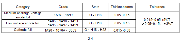 According to the standard GB/T 3615-2016 for aluminum foil for electrolytic capacitors, China specifies the brand, state and thickness specifications of electronic aluminum foil, as shown in Table 2-4.