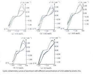 Figure 3-5 is the cyclic voltammetry characteristic curve of aluminum under the conditions of 2mol/L HCl and 30℃. The potentials corresponding to points a, b, c, d, and e are the passivation film breakdown potential (Ebd), anode reversal potential or anode current peak potential (Eap), and repassivation potential (ErP), respectively. Hydrogen generation potential (EH) per cathodic reversal potential or cathodic current peak potential (Ecp). Between EH and Ebd is the passivation zone of aluminum.