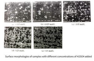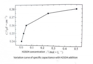 The peak anodic current during anodic polarization tends to increase with the number of cycles. This is due to the high density pitting corrosion on the surface of the aluminum foil samples. And the porosity keeps expanding and deepening, which is caused by the increase of the surface area of the sample. When adding 0.5moI/L Cro3 and H2 SO4 to 2moI/L HC at the same time, the passivation ability of the solution is greatly improved, the pitting corrosion is more difficult to occur, and the pitting corrosion density is smaller, but the strong protective ability greatly enhances the effect of surface erosion . The surface morphology of the sample after the cycle test is shown in Figure 3-14, and the change curve of the specific capacitance of the sample with the amount of H2SO4 added is shown in Figure 3-15.