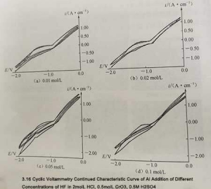 Figure 3-16 is quite different from the previous curve shape, the area enclosed by the loop curve becomes smaller during the scan. This is because the presence of HF greatly promotes the dissolution process of the passivation film and reduces the polarization overpotential caused by the additional polarization caused by the passivation film. Even with the addition of only 0.01 moI/L HF, the shape of the cyclic voltammetry curve is quite different from that without the addition of HF, and the anodic polarization current density and cathodic polarization current density increase significantly. When HF was further added, the current density was 2. Polarization increases significantly. Density growth slowed.